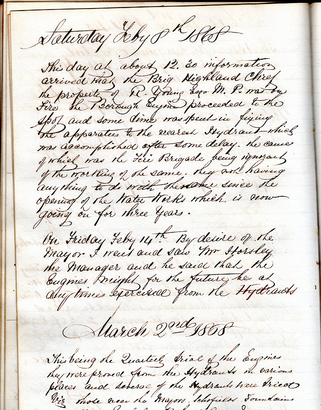 Photo left - Extract from Rust's Fire Brigade Incident Book, which shows the record of the fire on the Brig 'Highland Chief'.
